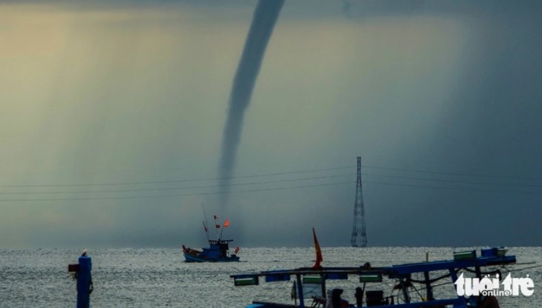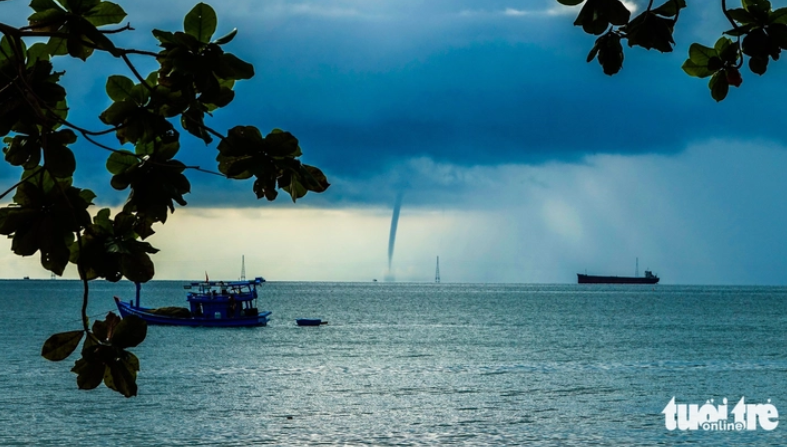 Nhìn từ xa, vòi rồng khổng lồ so với chiếc tàu đánh cá của người dân – Ảnh: CHÍ CÔNG