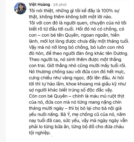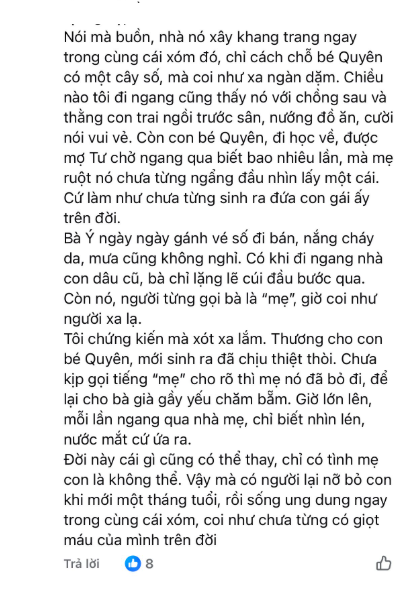 Quyên thương bà hơn bất cứ điều gì. Em sợ nhìn thấy cảnh bà lén lau nước mắt, sợ nghe tiếng ho khan trong đêm, sợ một ngày bà ngã bệnh, không còn đủ sức đi bán. Mỗi bữa ăn, bà luôn nhường phần ngon cho cháu, còn mình chỉ chan nước mắm với cơm nguội. Biết bà cực khổ, Quyên giấu bà chuyện mình không ăn sáng để tiết kiệm tiền. Có hôm, em chỉ ăn mì gói thay cơm, bữa trưa không có bà ở nhà thì ăn cơm chan nước tương. Vì thiếu chất, em bị thiếu máu, thường xuyên đau đầu, chóng mặt nhưng vẫn im lặng chịu đựng, không dám nói, sợ bà lo.