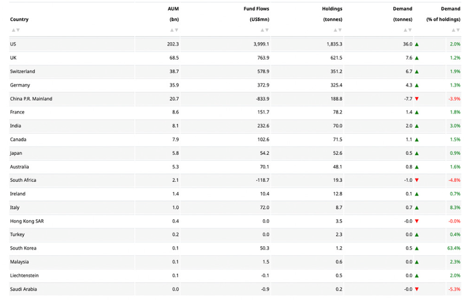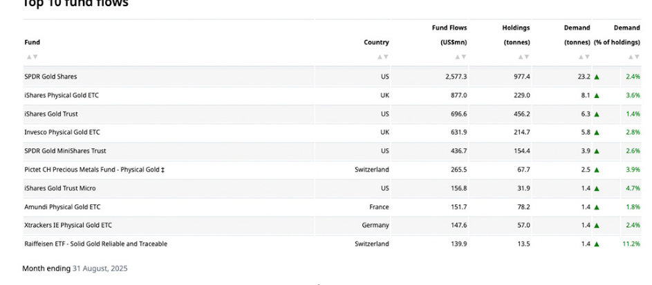 Tại Bắc Mỹ, các quỹ ETF vàng đã hút ròng 4,1 tỷ USD trong tháng 8, duy trì chuỗi 3 tháng tăng trưởng liên tiếp. Ở châu Âu, dòng vốn tiếp tục duy trì đà tích cực trong tháng 8 với 1,9 tỷ USD, đánh dấu 4 tháng liên tiếp tăng trưởng. Anh, Thụy Sĩ và Đức là những quốc gia dẫn đầu.