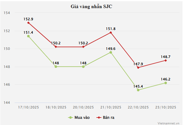 Trước đó, mở cửa phiên giao dịch 24/10, giá vàng miếng SJC được điều chỉnh tăng 300.000 đồng/lượng ở cả chiều mua vào và bán ra so với mức chốt hôm qua, niêm yết ở mức 147,8-149,8 triệu đồng/lượng (mua – bán).