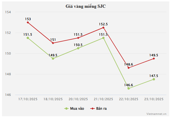 Ngày 23/10, giá vàng miếng SJC được niêm yết ở mức 147,5-149,5 triệu đồng/lượng (mua – bán), tăng 900.000 đồng/lượng so với mức đóng cửa hôm trước.