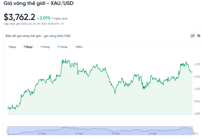 Giá vàng thế giới trải qua một tuần biến động mạnh nhưng cuối cùng vẫn giữ được đà tăng. Giá vàng bắt đầu tuần mới ngày 22/9 ở mức 3.687,74 USD/ounce, dao động trong phạm vi hẹp trước khi vượt lên trên ngưỡng 3700 USD/ounce vào sáng sớm thứ 2.