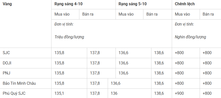 Giá vàng miếng trong nước cập nhật sáng 5-10 như sau:
