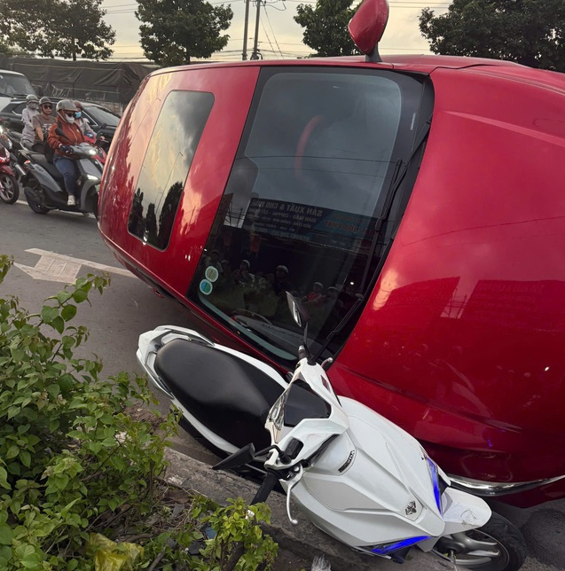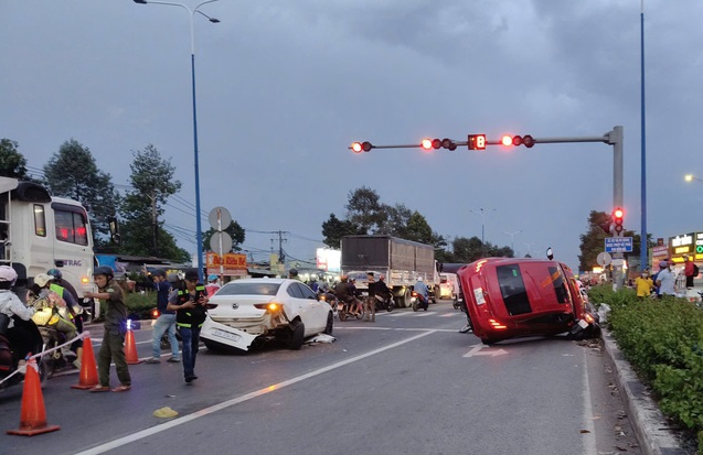 Chiếc xe này tiếp tục tông ô tô 4 chỗ màu trắng phía trước cùng nhiều xe máy dừng đèn đỏ. Chiếc xe gây tai nạn chỉ dừng lại khi lật nghiêng.