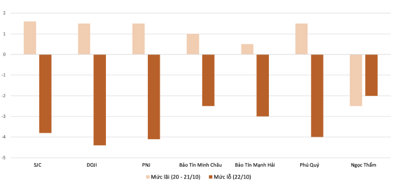 So với giá chốt phiên 21/10, giá vàng miếng bán ra tại hai thương hiệu này đều giảm 4 triệu đồng/lượng. Trong khi đó, giá vàng miếng mua vào giảm lần lượt 5 triệu và 4,5 triệu đồng/lượng.