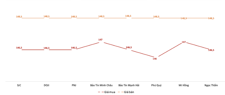 Mở cửa phiên sáng, Công ty SJC, DOJI, PNJ, Bảo Tín Mạnh Hải và Ngọc Thẩm đều niêm yết giá mua vào vàng miếng SJC ở mức 146,5 triệu đồng/lượng còng giá vàng miếng bán ra là 148,5 triệu đồng/lượng. Đóng cửa phiên sáng, các thương hiệu trên vẫn duy trì mức giá giao dịch trên.