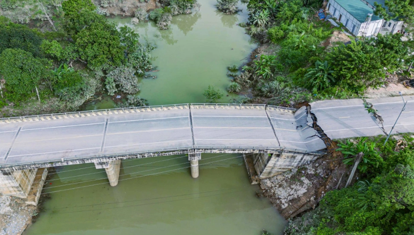 Tại hiện trường, một phần cây cầu bị nước cuốn trôi, phần đường sát cầu bị sụt lún nghiêm trọng. Cầu có nguy cơ bị đổ sập hoàn toàn do nước chảy mạnh.