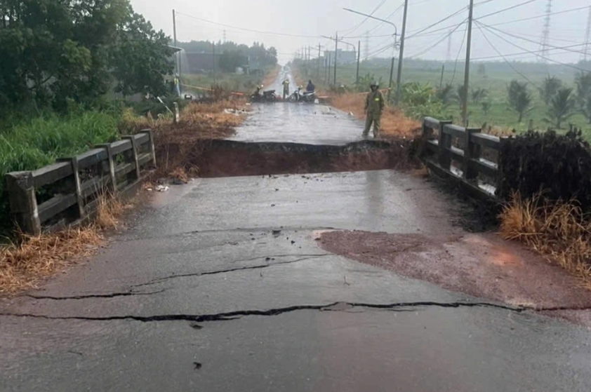 Sau cơn mưa lớn, một phần cây cầu trên đường số 40, phường Chơn Thành, bị sập, sụt lún khiến người dân không thể lưu thông qua khu vực.